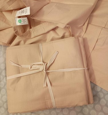 Beautiful very light muted pink duvet set (includes two pillowcases). First, the duvet and pillowcase set feel high quality, soft with a percale style feel. I love that it’s 100% cotton and breathable - doesn’t feel too hot or cold. It fits our queen duvet but I did note that it seems a bit short, it doesn’t give much extra on the sides which I prefer. The color is very neutral and leans more beige-y than pink which I appreciate but something to note! The set also can be a bit wrinkly but not unexpected given the material. Overall I highly recommend this set!