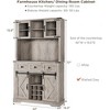 - AMPLE STORAGE SPACE: This versatile storage cabinet is tailored to fulfill your storage requirements. The upper hutch boasts 2 open shelves and 4 shelves with glass doors, while 3 drawers offer tidy organization for tableware. Accommodating 12 wine bottles and 3 rows of glass slots, this cabinet caters to your liquor collection needs. Two expansive side storage cabinets further enhance storage space, ensuring all your items are well-organized and within easy reach.
