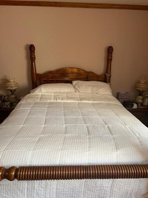 [This review was collected as part of a promotion.] Obviously I need to wash this so the packaging creases come out but I could not wait to see what it would look like on my bed! This is a thin quilt think perfect for warmer months!the white is crisp and clean looking but it does have some dot detail in it! It is super soft. It also came with instructions on how to fluff it!