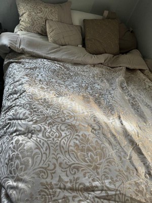 [This review was collected as part of a promotion.] I am obsessed with this Madison Park - Emilia 12 Piece Jacquard Comforter Set with Bed Sheets. It is a beautiful khaki and gold comforter set that adds so much elegance to my bedroom. I love the gold accents it has and love that it is a 12 piece set that comes with a sheet set, bed skirt , comforter, decorative pillows, shams, and Euro Shams! I love that it can be thrown in the washer as well if needed, no special washing needed. I do need to still get some Euro pillows so I am not able to use the Euro shams just yet.