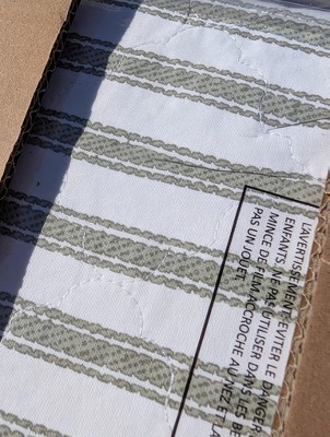 Opened and was immediately hit with super strong smell and got a headache. Stripes are printed on. Material is thin and rough. Not OEKO-TEX.