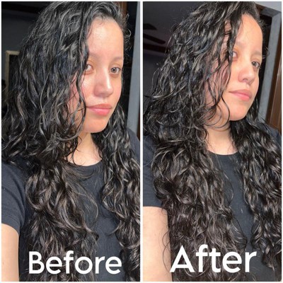 [This review was collected as part of a promotion.] I like the consistency; it’s thick which helps to moisturize my wavy hair really well and helps define my curls. In the pictures you can see a slight change in my curls, which look a bit more defined. It also leaves my hair soft