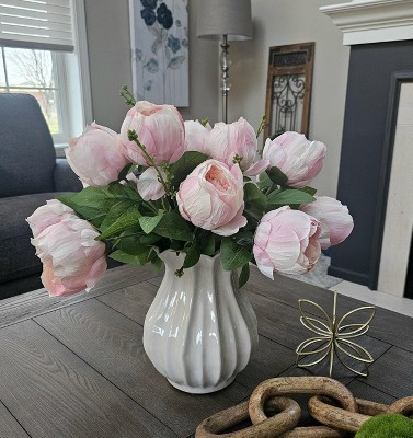 Makes such a lovely statement at a great price! Quality vase with nice weight. The finish varies with some having a more rustic appearance than others which makes each piece unique. I paired with (3) Ashland (Michael's) 20" light pink peony bushes.