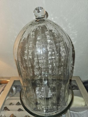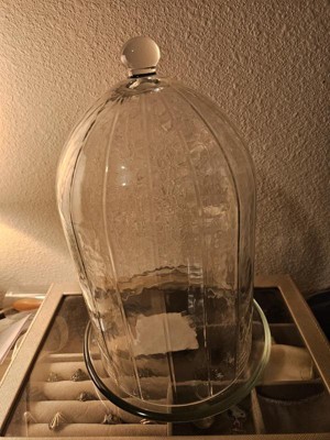 The small cloche is a fun decor item. It is simple and versatile, so you can showcase whatever your heart desires. The dome has weight to it and the glass is ribbed for a stylish design. The knob at the top allows you to easily pick up the dome. This is 10" in height and the perfect size for my tabletop.