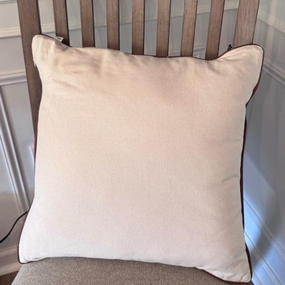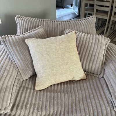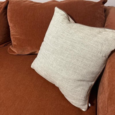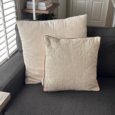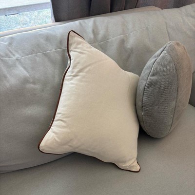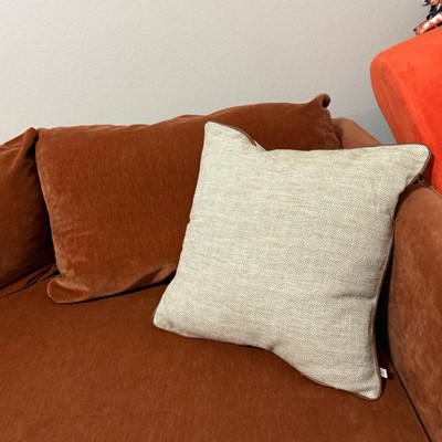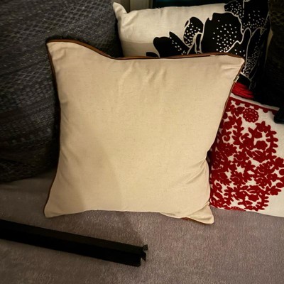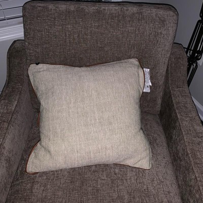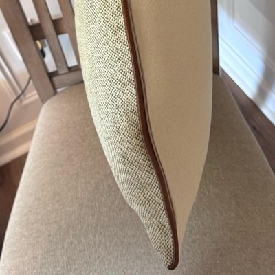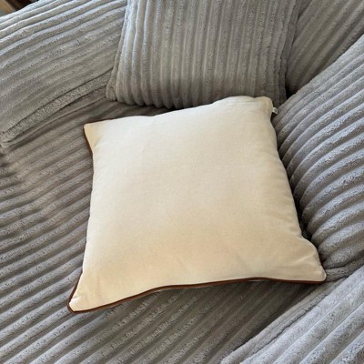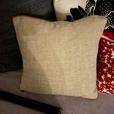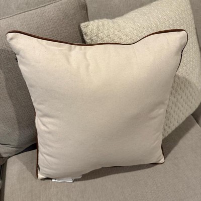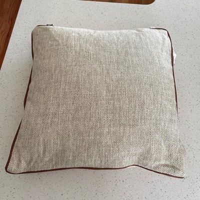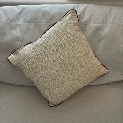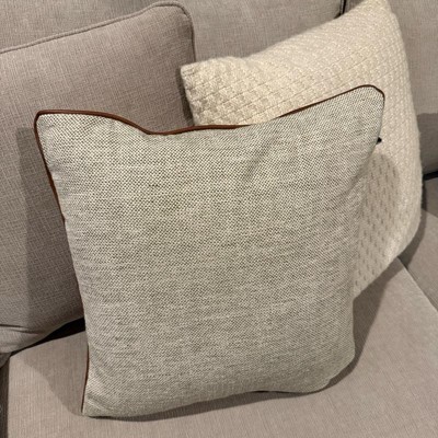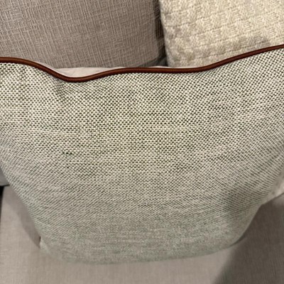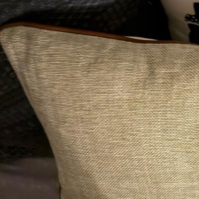 This is the Hearth and Hand 18 inch tweed with faux leather square toss pillow. I love the faux leather piping. It makes it look expensive. This is a true decor pillow. It is not as soft, but more for decoration. This is a great neutral look. The tweed actually has dark green woven in, but you have to look closely. The cover is also removeable.
