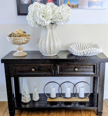It’s very pretty but it’s large. I suggest you have it on a large table with extra flowers that drape over the vase.