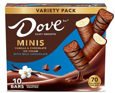 [This review was collected as part of a promotion.] I love these two-bite ice cream bars! The luxurious creamy Dove milk chocolate houses soothingly sweet ice cream, making a refreshing summer treat. Individual wrappers keep each frozen mini bar fresh... and are great to assist with portion control.