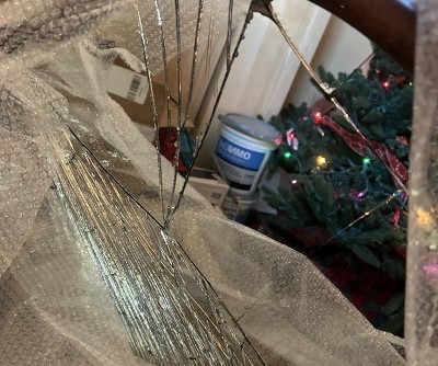The box the mirror arrived in was crushed. One box corner was completely caved in. No surprise when I opened box the frame and glass were shattered.