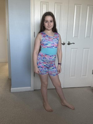 Tap dance to front flips, whatever the activity; they will shine in this Dance Brushstrokes Biketard from Cat & Jack™. Designed in a one-piece silhouette, this sleeveless biketard features a vibrant brushstroke pattern with rhinestones detailing in the middle for a charming appeal. Soft, stretchy jersey fabric with a cotton gusset design keeps them in breathable comfort during any activity, and elastic at the leg openings offer unrestricted movement. Whether getting ready for gymnastics, dance or yoga practice, the sleeveless biketard will allow them to flip and move to their heart's content.