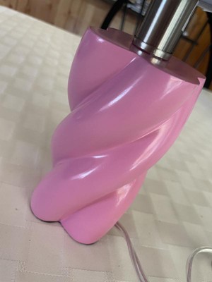 • A: The lamp features a playful pink twisted base, adding a fun design element.
