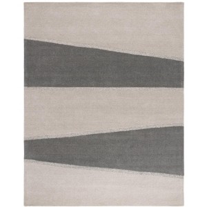 Elevate the aesthetic of any space with our hand-tufted area rug, sized 8 feet by 10 feet for a significant presence in your home or office. The modern design harmonizes grey and charcoal hues in a large rectangular shape, presenting a sophisticated pattern of bold and sweeping linear motifs.