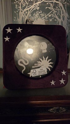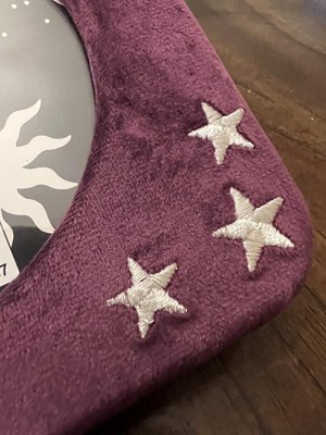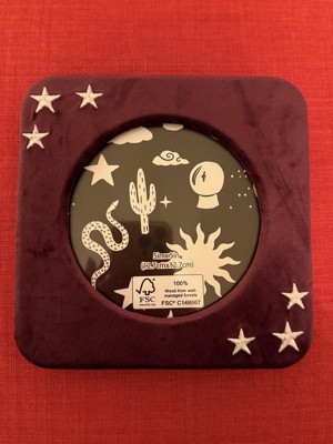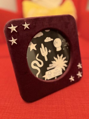 This is such a fun frame! The size is perfect for hanging in a gallery wall or on a bookshelf, or really anywhere. The purple velvet is soft and lovely, but I am positive it will collect dust like crazy! The embroidered stars are a nice touch and give it a more celestial vibe than I'd like, but its still cute. Love the size, but havent decided what photo to put in it yet... probably one of my cats, Nova and Luna!