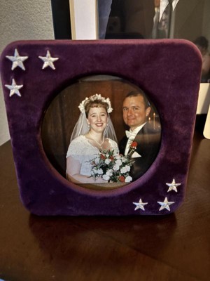 What a stunning picture frame, truly one of a kind! The deep purple velvet, accented with embroidered white stars in each corner, gives it an elegant and very distinctive touch. The circular 6.5 by 6.5 design adds charm to any photo. I absolutely love this frame. Its unique style enhances any décor, and it’s such a beautiful way to showcase a special picture. Its also very well made. The back of the frame has hardware that is very secure. You can hang if you choose as well. LOVE!
