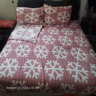 [This review was collected as part of a promotion.] This matelassé snowflake quilt set is so much prettier than I expected. The fabric is delicate but washes well, soft and inviting. The color is beautiful, a muted red color that goes well with our decor. It has a generous four for a full/queen size. Comfortable to sleep under and definitely makes our bed more festive for the holidays.
