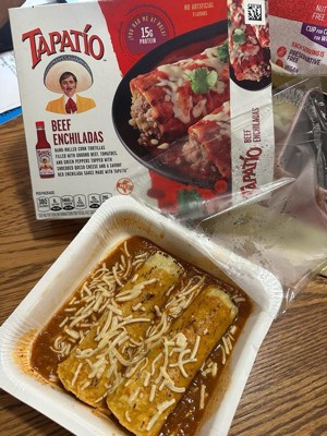 [This review was collected as part of a promotion.] The Tapatio beef enchiladas are very flavorful! The spice level I would say is 0 on sale of 5. There is no weird aftertaste, it tastes amazing! Especially being a quick microwave frozen dish.