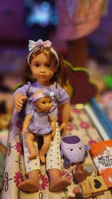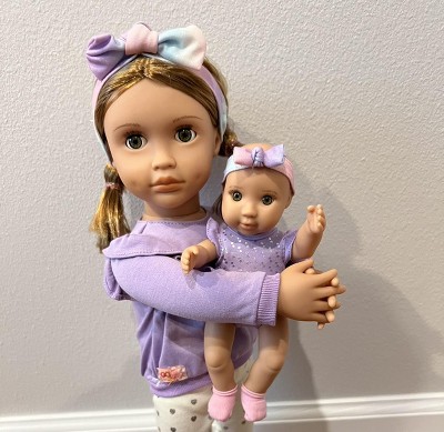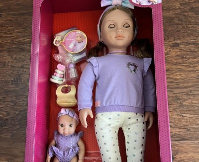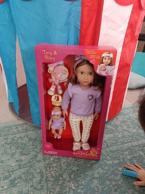 - Includes: 18-inch doll Tory, 8-inch baby doll Riley, 2 headbands, a sweater, a pair of undies, leggings, shoes, a baby doll onesie, a pair of socks, a pacifier, a bib, a baby bottle with a removable top, a blanket, a teether, and a 5-piece stacking toy.
