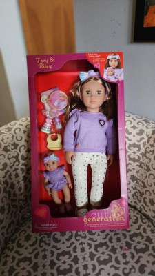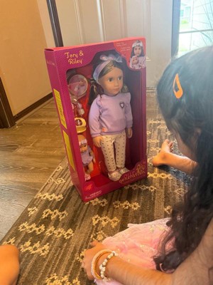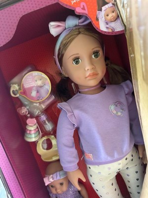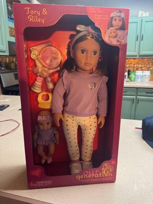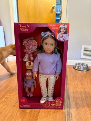 - Babysitter & Baby Doll Set: Take on the role of best babysitter ever with Our Generation 18-inch doll Tory and her baby sister Riley!