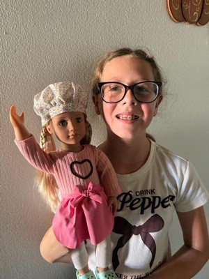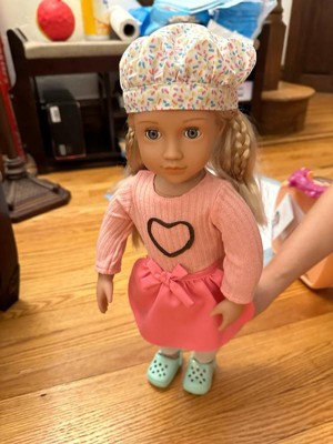 Our Generation Emery Posable 18" Doll with Baking Accessories and Story Book: Straight Blonde Hair, Gray Eyes, Food Theme