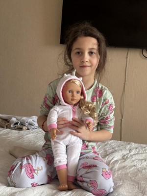 [This review was collected as part of a promotion.] This our generation doll named Lillian is super cute!! She is made to look close to life like. Her eyes really open and close as if she were blinking. She has a unicorn zip up onesie pajama outfit. The hood has the unicorn on on top which is super cute. She has cute shoes with charms on them. Her body is soft and her arms and legs are moveable. You can interchange outfits in her if you have others . She is an 18-inch doll. Her hair is nice and long and pretty. You can style her hair many ways. She also has a butterfly shaped pillow! Overall she is a great doll to have!!