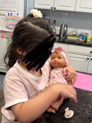 [This review was collected as part of a promotion.] My daughter loves this adorable baby doll. The facial features are detailed and have a realistic look, especially the eyes. The body is soft, so the doll can be cuddled. The outfit is precious, including a beautiful head bow. The pacifier is fun for pretend play and is easy to secure in the doll’s mouth. Overall, this is a great high-quality doll that my daughter is really enjoying for playtime.