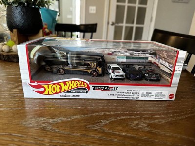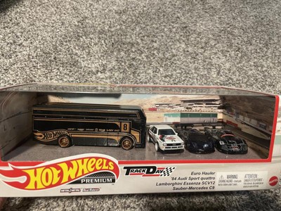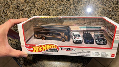 [This review was collected as part of a promotion.] Hot Wheels premium pack Track day with 3 amazing cars and one cool hauler. This is a must have for collectors as all vehicles have a nice set of wheels and a premium paint job. There is a Mercedes, Lamborghini, Audi and my favorite the Euro hauler. All these cars are great just wished the Audi was a bit newer models like an R8 supercar would have been awesome. My favorite one for me would have to be the Hauler as its black and bronze paint design is so detailed and amazing. Great for collectors a def must have!