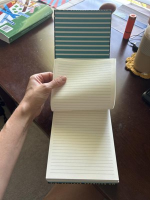 This notepad is so well designed and crafted that it might actually help elevate the words written within it. Gold tone double rings at the top. Gold foil words on the cover capture light and have lighthearted whimsy. Inside, the pages are ruled and striping on the inside cover matches striping on the outside paper binding. All this style is matched by substance- pages are lined front and back- you do some serious writing with this lay flat hardcover notepad. It actually feels like a vertical journal, if that’s how you would like to use it.