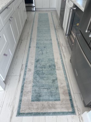 Rug is well made and looks just like the pictures. I purchased the aqua & cream colored one and color is same as in picture. Very rich looking and just the right height, soft on my feet but not to plush as to cause a trip hazard. I bought the 14' runner and it looks very nice on my wooden floor. Any creases have come out very quickly. I owuld recommend this rug and I did shop around and the price was excellent for this size runner compared to other retailers.