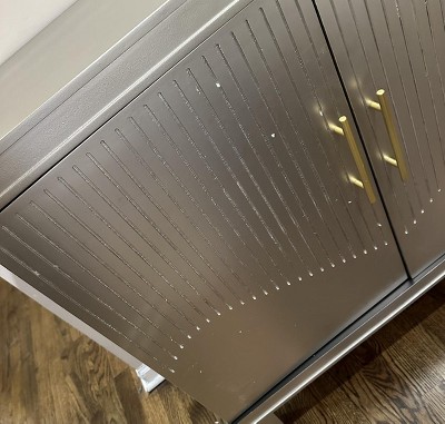 This side board has simple lines with matalic sliver surface. The design is a 5. But the unit quality is rather poor. The material is almost cardboard like. It chips easily. There are scracthes and nicks on surface.