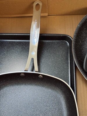 [This review was collected as part of a promotion.] I bought a small saute pan in granite stone and loved it so much that I wanted the full set. I'm very pleased with this set and think every single piece is really nice. They are completely non-stick and so easy to wash, since nothing sticks. The only thing that I would suggest as room to improvement is that the handles are flat and hard to pick up, but with a pot holder, they are fine. They are thin and flat for aesthetics I'm sure as they look very sleek. I just wish they were a bit thicker or more well rounded for easier holding in a hand. Honestly, it doesn't really matter and I definitely recommend this set for anyone who uses a lot of different types of pots and pans and bakeware as this set is pretty well rounded. Love it!!