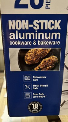 [This review was collected as part of a promotion.] This 20 piece cookware set has been a wonderful addition to my kitchen. It comes with a variety of pots, pans, a lids, and some utensils. It has a solid non stick surface that allows for metal utensils to be used on it. I still prefer to utilize the utensils that came with it, or the wooden ones I already have though. Clean up with these is a breeze. They are dishwasher safe, but we wash all our dishes by hand. They seem to cook food quickly and evenly and have held up through multiple uses. Overall, I’m very pleased with this set.