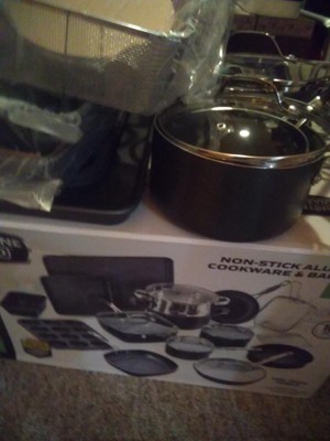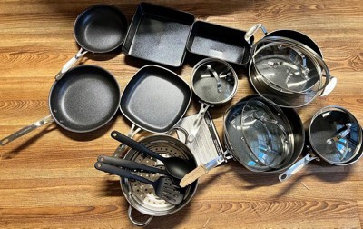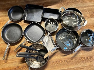 [This review was collected as part of a promotion.] Overall I have been pretty impressed with this whole set. It has an appealing look and looks upscale. The full set of cookware and bakeware include everything that I need for my kitchen needs. I can prepare everything I need within the pots and pans included. The bakeware is perfect for those treats and desserts as well. We use no oil or just a few drops of oil in our cooking now. The food doesn't stick and it comes out of the pans easily. Really an exceptional technology for the ability to release food so easily. The only concern I do have with this is that it is a very soft aluminum. Mine took a little tumble into the sink while washing and bent / misshaped the circular shape of the pot. My word of caution with these due to the soft metal. Overall I'm pleased with the utensils, lids, and all cookware for cooking purposes.