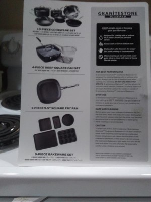 [This review was collected as part of a promotion.] The GraniteStone 20 Piece Complete Cookware + Bakeware, or "Kitchen in a box", is a great collection of almost all the pans you would use in any kitchen. These pots and pans can be used on the stovetop or the oven up to 500 degrees. I have cooked bacon, hamburger with mac n cheese, roasted chicken with potatoes, and Banana bread. They really are non-stick! Each time, with each pan, cleanup was a breeze. The only problem at all with these is the fact that the metal handles on the pans and lids get way too hot, even on the stovetop, so you must use potholders any time that you cook.