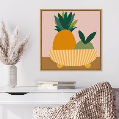This artwork features a minimalist abstract depiction of a fruit bowl. It includes a vibrant orange, a slice of watermelon, a pear, and a cluster of grapes, all rendered in a bold, colorful, and geometric style. The background is divided into soft pastel colors, enhancing the modern aesthetic. This canvas art print was created by Regina Morre and printed in Waunakee, WI. The canvas is stretched by hand and finished with a float frame. Individually made using traditional custom framing techniques, it has the quality you would expect from your local frame shop.