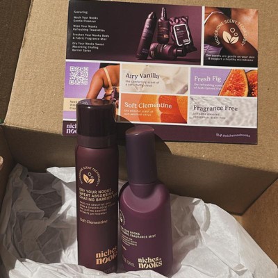 For years I havebiught lume online, but lately their spray deodorant has turned into drizzles raher than sprays. I saw that Target carries Lume and then I spotted spray deos by Athena, Native, and Niches and Nooks. I bought some of all three brands and was happy to find out that all three had a good functional spray, I don't want to say powerful because that sounds like it blasted my niches and nooks, (ps I love the clever name!) The spray is dry so doesnt eave me wet or damp, it's cool and makes overheated areas (pits) feel better. Ive tried airy vanilla and soft clementime, and ordered 1 of each of the other scents. So far re vanilla is my fave. The cans are smaller than the other brands', and might fit a purse, I also got some wipes, thinking a small purse sized pack would be handy. I'll keep buying Niches and Nooks!