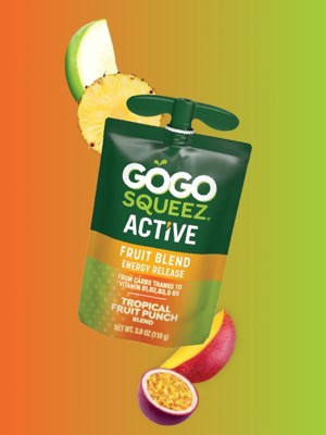 Keep the fun going with GoGo squeeZ Active Energy Release, the sports snack made for an active lifestyle. This tasty fruit blend snack is powered by real fruit, including apple, mango, pineapple, and passion fruit, and is an excellent source vitamins B1, B2, B3, and B5 which help release energy on-the-go . With no sugar added** and a gluten-free, nut-free, and dairy-free recipe, GoGo squeeZ Active Energy Release is a pre-gym snack you can feel great about. The best part? These pouches are 20% bigger† than our original pouch, for even more deliciousness to squeeze out and snack on. Stock up for a long run or a yoga class with each of our tasty Energy Release fruit snack pack flavors: Strawberry & Guava and Tropical Fruit Punch. *Vitamins B1, B2, B3, and B5. †Fruit Blend with Energy Release 3.9 oz vs Regular Pouch 3.2 oz. **Not a low-calorie food. See Nutrition Information for sugar and calorie content.