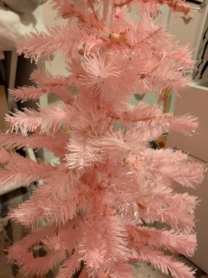 Transform your space into a whimsical wonderland with this pink holiday tree. This charming tree is adorned with delicate clear lights, casting a soft glow reminiscent of twinkling stars. Its slender profile makes it an ideal fit for cozy corners or tight spaces, while the radiant pink hue adds a touch of enchantment to any room. Crafted with care, this tree comes with a complimentary light pink plastic stand that perfectly complements the vibrant pink tinsel color palette. Whether decking the halls for holiday or infusing romance into Valentine's Day celebrations, this tree is a versatile addition to your decor repertoire. Effortless assembly ensures a stress-free setup, allowing you to focus on the joy of the season. Its compact size makes it perfect for display at the office, on tabletops, or in small corners. Product Features: Pre-lit with 50 clear lights Bulb size: mini - 2.5V Bulb type: incandescent 80 tips 2.5” wide tapered tips 38” pink lead cord Additional Product Features: Medium profile tree UL-certified and approved For indoor use only If one bulb burns out, the rest will stay lit No assembly required – tree comes in 1 piece Comes with a FREE plastic tree stand Comes with replacement bulbs and spare fuses Wire gauge: 22 120 volts, 60 hertz, .17 amps, 20.4 watts Dimensions: 3’ high (from the base of the stand to the top of the tree) Distance from floor to the first row of branches: 8” 15” base diameter (at the widest point) Stand: 2" high x 12" wide - each leg is 6" Material(s): tinsel/metal/glass bulbs/wire Note: Branches are compressed for shipment, and need to be fluffed out upon arrival to look like the photo.
