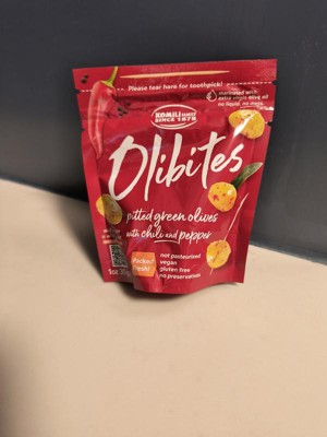 These a r e very Delicious! I don't usually enjoy my olives this much but Obibites has created a great product. These a r e pitted green olives with chili and peppers. The spice taste is just right!!
