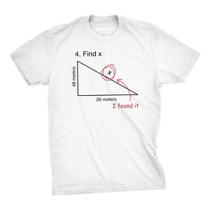 • Math Humor Tee; Geometry Joke; Triangle Problem: Features a printed right triangle with “Find X” problem and hilarious handwritten “I found it” response; perfect for math teachers and witty students.