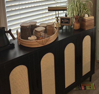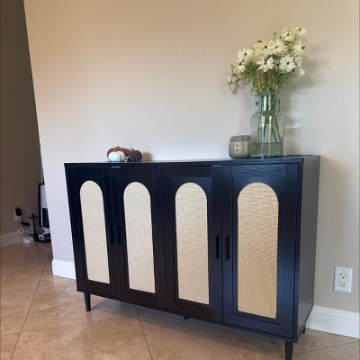 Garvee Rattan Sideboard Buffet Cabinet, 4 Doors Accent Storage Cabinet, Console Table Coffee Bar,Adjustable Shelves for Kitchen, Hallway, Living Room