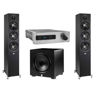 This bundle features premium audio components to enhance your sound system. It includes 2 Elac DF63-BK 6.5" Floor Speakers, 1 Elac DS-A101-G Discovery Amplifier, and 1 Elac PS250-BK 10" Powered Subwoofer. The Elac DF63-BK speakers showcase custom aluminum tweeters and aramid fiber woofers for high-quality sound. With a sleek black ash finish, these speakers boast a 3-way, bass reflex design and a frequency response of 31 to 38Khz. The Elac DS-A101-G Amplifier delivers 80 Watts per channel and features ABC Technology for optimal bass integration. It offers various inputs, Wi-Fi connectivity, and Bluetooth audio support. The Elac PS250-BK Subwoofer provides powerful bass with 250 Watts RMS/Peak output and DSP Digital Signal Processing for accurate audio processing. Its 10" treated paper woofer offers a frequency response of 27Hz to 150Hz. With a modern design and advanced features like app control and Auto EQ, this subwoofer is a perfect addition to your home theater experience. Upgrade your audio setup with this comprehensive bundle.