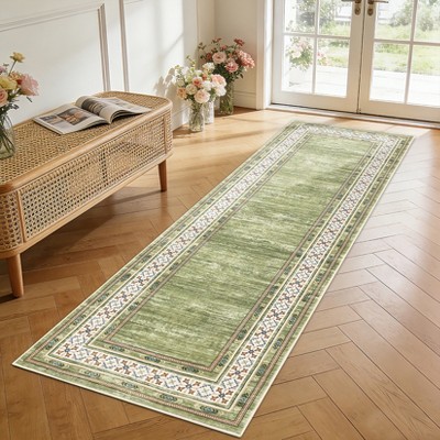 Vintage Washable Area Rug Non Slip Indoor Floral Print Distressed Rug: Green, Stain-Resistant, Polyester, 2'x6', Traditional