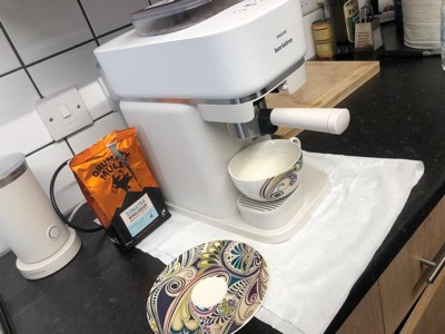 [This review was collected as part of a promotion.] Absolutely love this coffee machine, it’s white so it matches my kitchen perfectly and it looks so cute and stylish too! It’s so so easy to use aswell, the coffee beans go in the tip, it even comes with a milk frother so you can have a frothy coffee , it’s easy to assemble and easy to clean and not very noisy either , plug it in and away you go!!