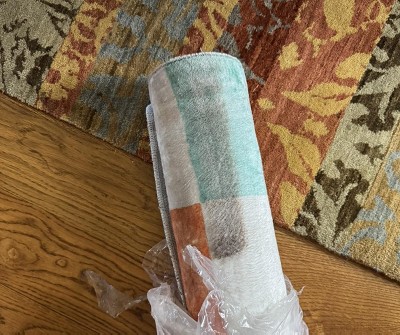 Vibrant colors and thin like I wanted, yet still very soft. However it arrived dirty in numerous spots, even where it was rolled up. The thought of rolling it back up and taking it all the way back to target and reordering made my head spin so I just used some carpet cleaner as best I could. It’s clear someone else had the rug before me and they rolled it back up