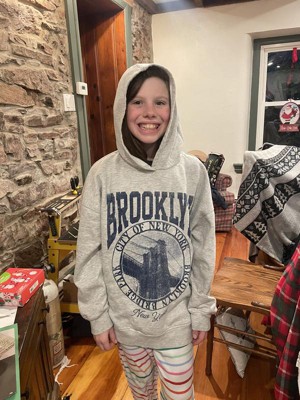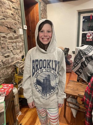 My 10 year old daughter really likes this hoodie. The neutral gray color goes with leggings/jeans/joggers. She is petite so it runs a little bigger on her but she loves that. The Brooklyn logo is super cute.
