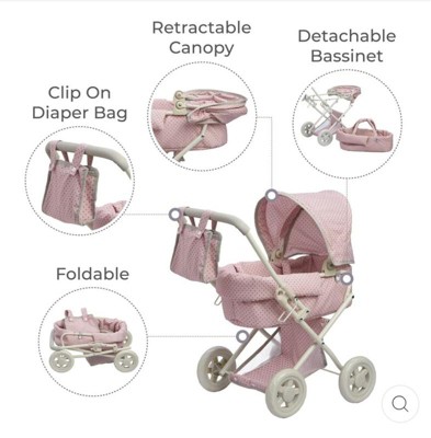 [This review was collected as part of a promotion.] I received for free the Polka Dot Princess Baby Doll Pram Stroller from Influenster in exchange for my honest review. Assembly was a breeze—everything clicked together smoothly, and I had it ready in no time. The pram is absolutely adorable with its pink and gray polka dot design, making it a delightful addition to our playroom. My daughter loves taking her baby dolls and stuffed animals for walks, both inside and out. The retractable canopy and all-terrain wheels make it perfect for outdoor adventures. Plus, the detachable diaper bag and storage basket are great for storing all her doll accessories. Overall, this stroller is not only pretty but also functional and durable. I can already tell it's going to be a favorite toy for a long time! Highly recommend for any little one who enjoys imaginative play!