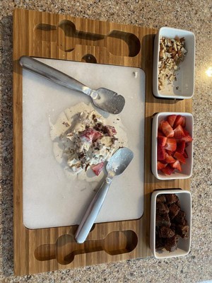[This review was collected as part of a promotion.] We all love the Parlor Ice Cream mixing set. It looks very fancy and design. The bamboo board, marble slab and ceramic dishes look study and pretty. The mixing spades looks nice BUT bend the first time we used them. The ice cream must have been too hard! but I put them back and it was ok, it will just bend again over time and you just fix them back up. My girls loved being able to do like in an ice cream store mixing whatever they want and make yummy ice cream treats. The only thing, don't forget to put the marble slab in the freezer before, I did, the first time, forgot and my ice cream melted too fast, it was really warm inside. It is a real marble slab and will keep the ice cream really cold for several batches. A great product, great for teen ice cream party!