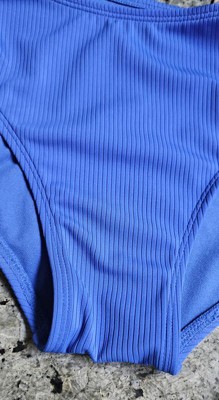 Love the vibrant blue color of this swimsuit. The fabric is ribbed and the bottoms are rouched on the sides. It fits true to size and is really great quality. It has a nice amount to stretch to it and adjustable straps. My daughter loves it!
