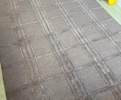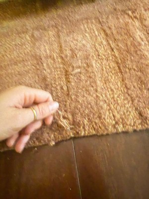 Upon initial opening, I was pretty happy, although the color is much more purple than brown. I also noticed the design was not as defined as the product photo. More on that later. Once I vaccumed the rug 3 times, 4 times, filling the canister each time, I got down on my hands an knees and saw that there was a TON of excess fiber from the manufacturing process still on and in the rug. I grabbed my lint/pet hair removal tool of choice and got to work, removing as much fiber (lint?) from it as possible. To be clear, I was not removing fibers that were ATTACHED to the rug. Everything that was coming off was a result of the process of cutting the design into the rug loops and was not attached to the piece. It held up well to this process. 3 hours later I had filled a five gallon bucket with fiber. The rug looked much cleaner and nicer, more like the product photo. I feel I was sent an incomplete product and would not have been able to keep it if I didn't have the ability to finish the job.