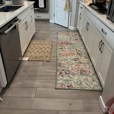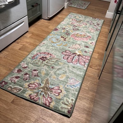 Add a pop of color to your flooring with this Floral Memory Foam Runner Rug from Threshold™. This rectangular accent rug is adorned with a seamless floral pattern in vibrant shades on a sage green backdrop, adding a lively touch to any indoor space. Plus, it features a low-pile construction crafted from 100% polyester with memory foam backing, making it perfect for frequently-used areas like your kitchen, living room, hallway or entryway.