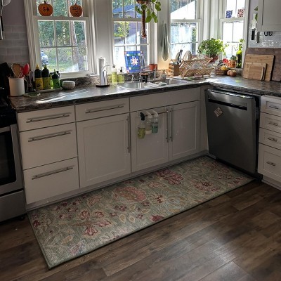 I bought this to replace a former runner in my kitchen. It is a nice pattern with spring colors. There is padding underneath your feet don’t hurt when you do the dishes or fold laundry if you have it in your laundry room